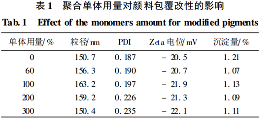 从表 1 可以看出, 经改性后, 颜料粒子的平均粒径增大, 由未改性的150. 7 nm增长至聚合单体用量100% 时的163. 2 nm, 但随着单体用量的增 加, 体系的平均粒径逐渐减小, 体系的多分散指数 P DI 变大。改性前后, 体系的 Ze ta 电位变化不大, 但改性后颜料经离心产生的沉淀物减少。
