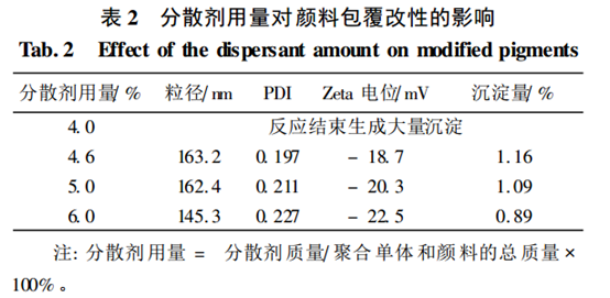 2) 颜料分散时分散剂用量过少将影响体系的稳定性, 生成大量沉淀, 过多会产生乳胶粒, 使体系的平均粒径下降。