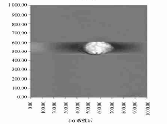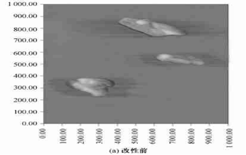 利用 CSP M 400 0 型扫描探针显微镜对改性前后颜料粒子进行扫描, 观察颜料粒子表面形态的变化。图 1 为改性前后颜料表面形态的扫描探针显微镜图片。图 1( a ) 说明改性前颜料粒子呈不规则的棒状,表面凹凸不平; 图 1 ( b ) 表明, 改性后颜料粒子呈长椭圆型, 表面光滑。改性后形成的聚合物包覆颜料粒子, 使得表面形态发生变化。