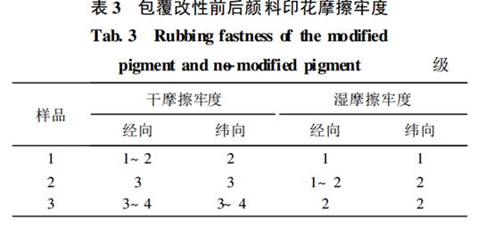 3) 包覆改性后的颜料干湿摩擦牢度得到明显提高, 与未改性的超细颜料相比, 干摩擦牢度提高1 1 5 级, 湿摩擦牢度提高 1 级, 与加入黏合剂的超细颜料印花相比, 干湿摩擦牢度均提高半级。